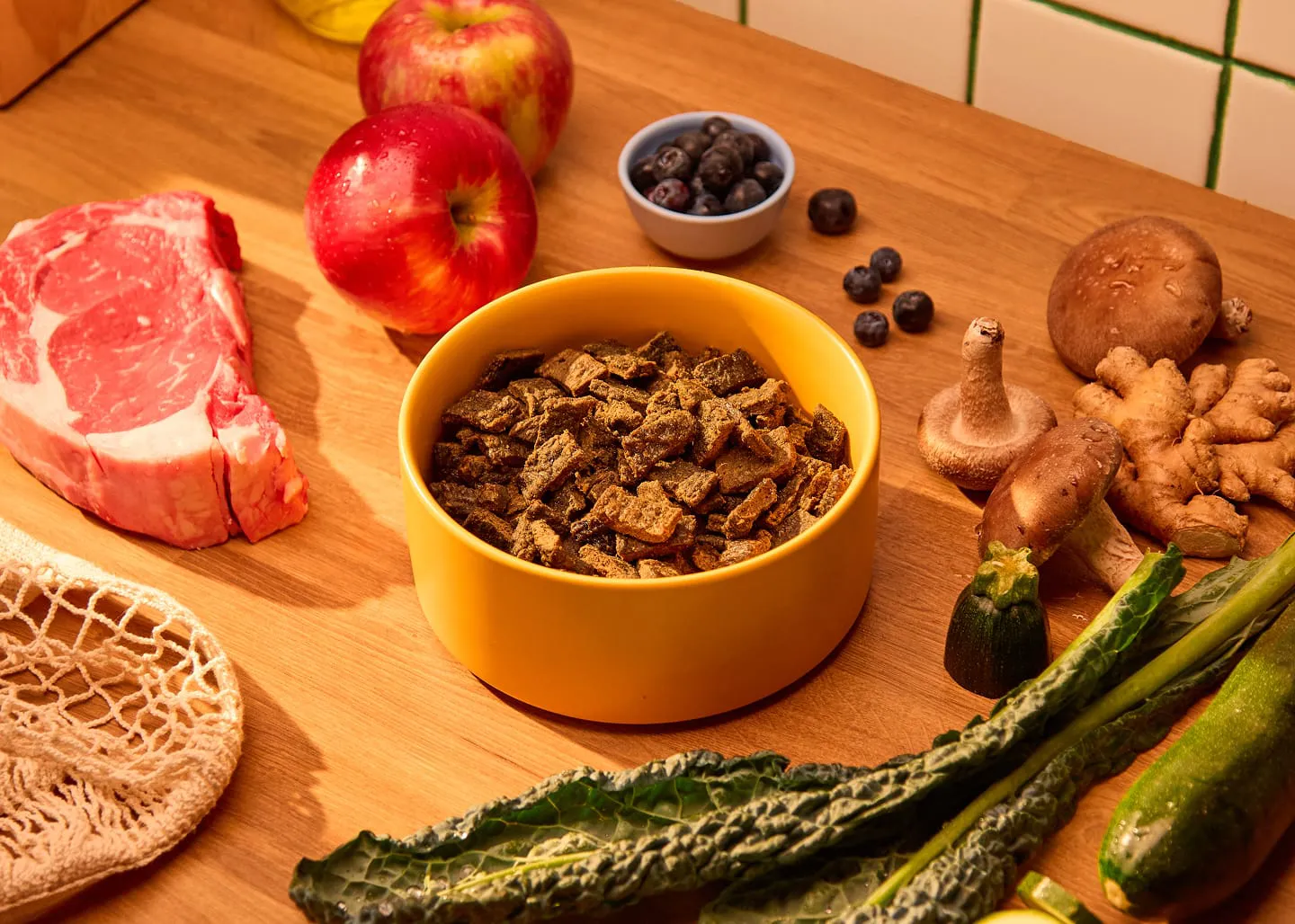 Beef, Beef Heart, Beef Liver, Beef Bone, Quinoa, Pumpkin, Fish Oil, Sunflower Oil, Zucchini, Kale, Flaxseed, Salt, Parsley, Dried Kelp, Dried Chicory Root, Turmeric, Mixed Tocopherols (Preservative), Ginger, Selenium Yeast, Blueberries, Carrots, Apples, Tomatoes, Shiitake Mushrooms, Broccoli, Oranges, Cranberries, Spinach, Beets, Cherries, Strawberries